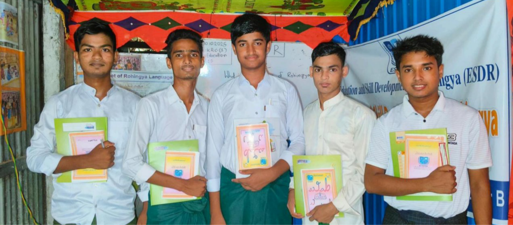 At ESDR’s learning center, 13-year-old Kohinur Akter carefully traces letters in the Rohingya Hanifi script. Though she is a school-going